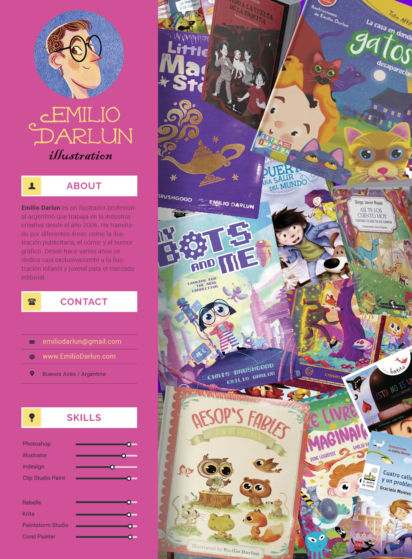 Su pasión por la ilustración infantil nació al absorber los libros para niños electromagnéticos, que un cometa solía dejar en su habitación cósmica.Emilio realiza ilustraciones para Argentina, Estados Unidos, Europa y para galaxias lejanas de mundos paralelos. Después de volar, navegar, bucear, saltar y bailar, ilustrar es lo que más le gusta hacer.